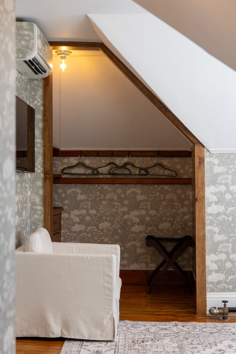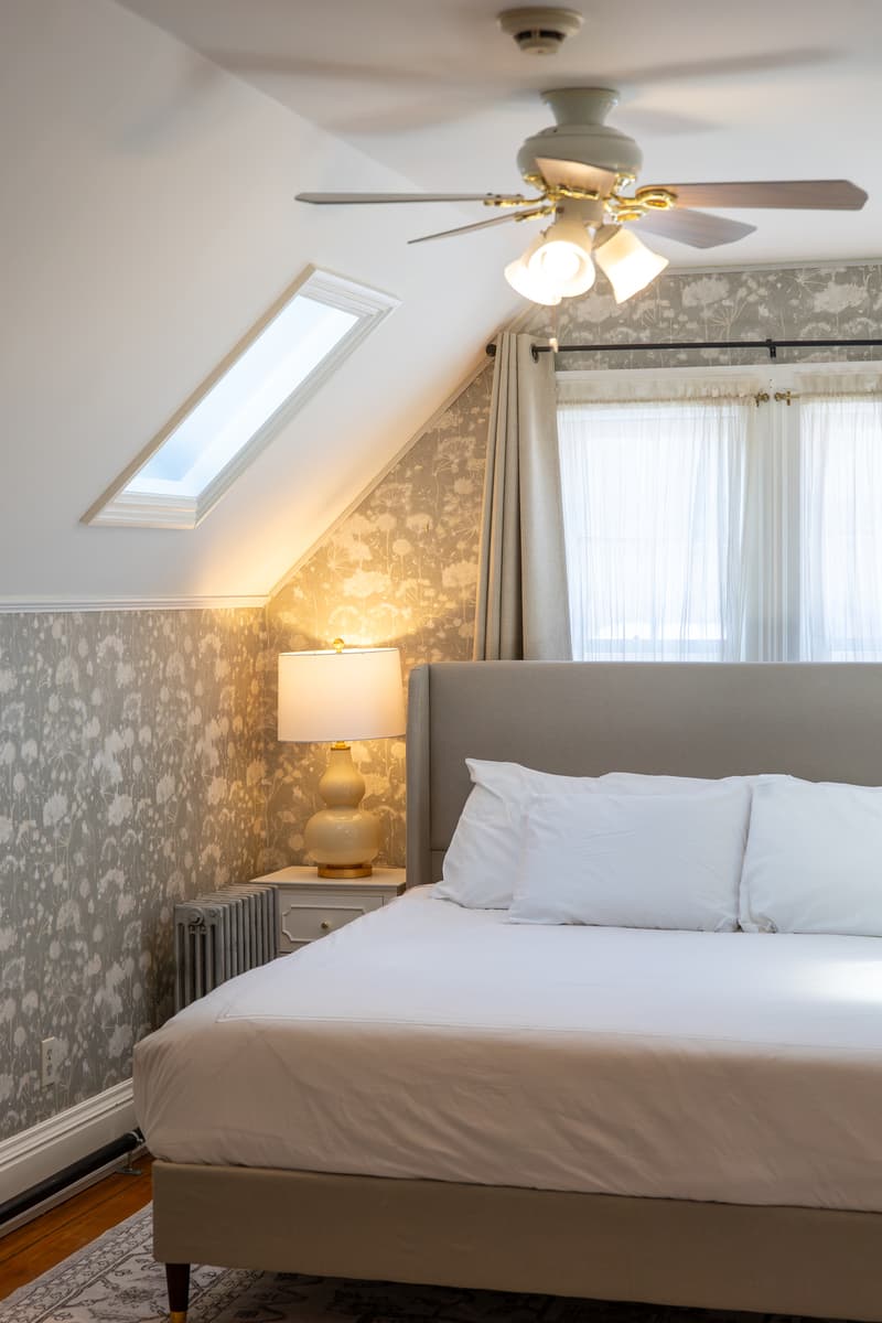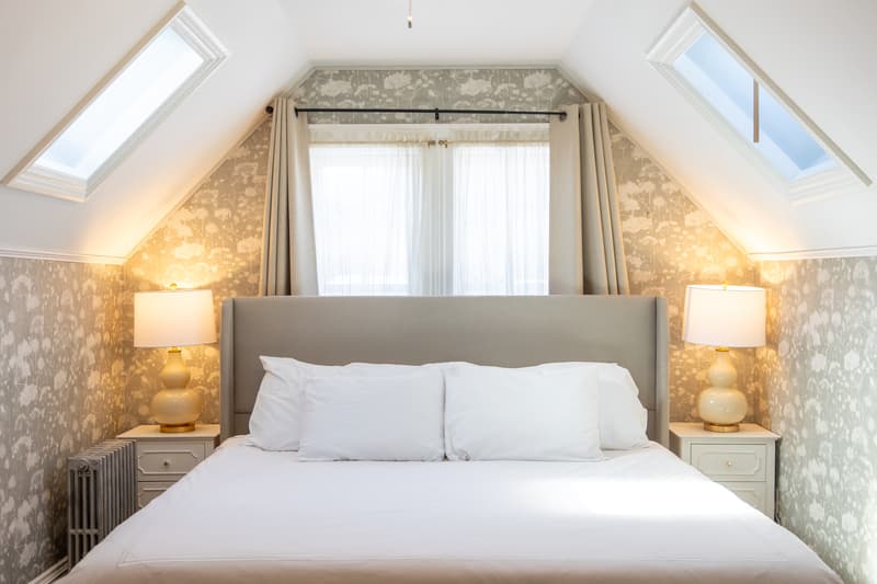 Our most peaceful hideaway. The Margaux Suite is tucked away on the top floor and designed for deep rest, featuring a plush king bed, soft gray patterned wallpaper, and plenty of built-in storage. Spacious, serene, and wonderfully private - this is the room for guests who want total calm.